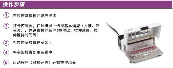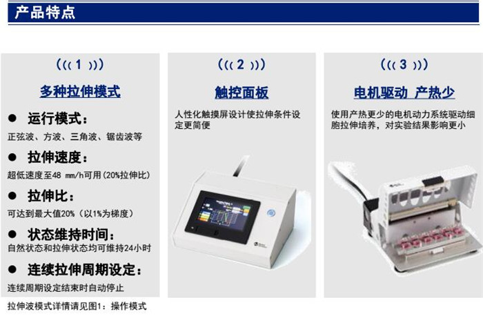 “ShellPa Pro”是一种机械细胞拉伸系统,用于复制人体内部的动态环境,并对体外培养的细胞施加机械压力。 在传统的静态细胞培养中,培养细胞的变化和反应是可以观察到的。“ShellPa Pro”除了“ShellPa”的基本功能外,还提供了更多样的动态环境。 产品特点: (1)多种拉伸设置模式可用 • 运行模式:正弦波、方波、三角波、锯齿波等 • 拉伸速度:超低速度至48 mm / h可用(20%拉伸比) • 拉伸比:可能达到Z大值20%(在1%个步骤中) • 状态维持时间:拉伸状态和非拉伸状态均可维持24小时 • 连续拉伸频率设定:设定频率结束自动停止 (2)触屏面板 人性化触摸屏设计使条件设定更简便 (3)电机驱动 生热少 使用生热更少的电机驱动细胞拉伸,对实验室培养影响更小